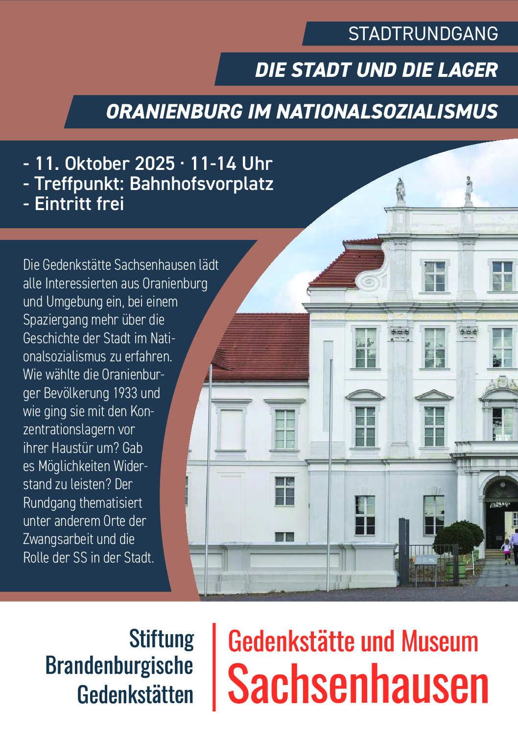 Die Gedenkstätte Sachsenhausen lädt alle Interessierten aus Oranienburg und Umgebung am 11. Oktober 2025 ein, bei einem Spaziergang mehr über die Geschichte der Stadt im Nationalsozialismus zu erfahren. Wie wählte die Oranienburger Bevölkerung 1933 und wie ging sie mit den […]